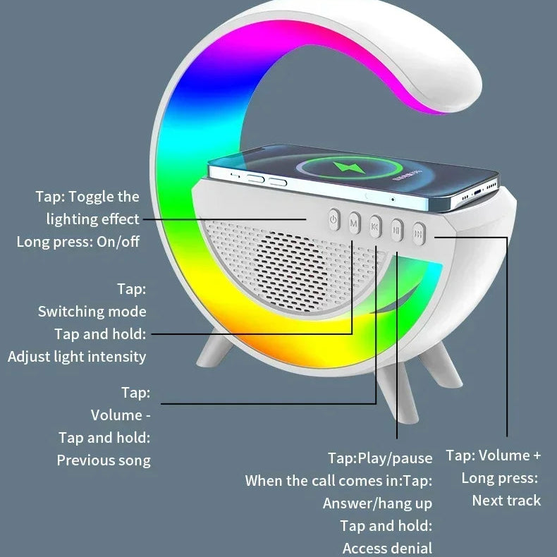 3-in-1 Functionality: Wireless charger, Bluetooth speaker, and ambient LED lamp.