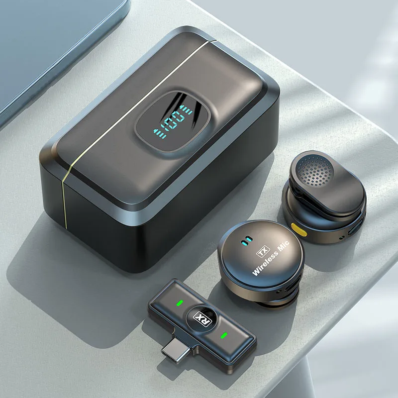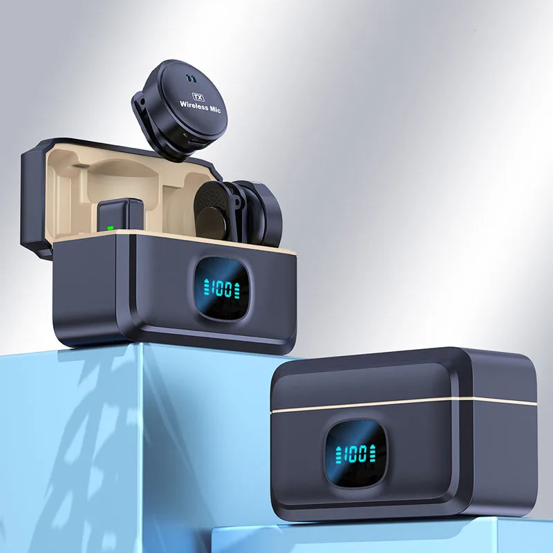 Modern dual wireless microphone system built for crystal-clear audio recording. Comes with two transmitters and a smart charging case featuring a digital battery display. Ideal for interviews, vlogging, live streaming, podcasts, and video recording on the go.