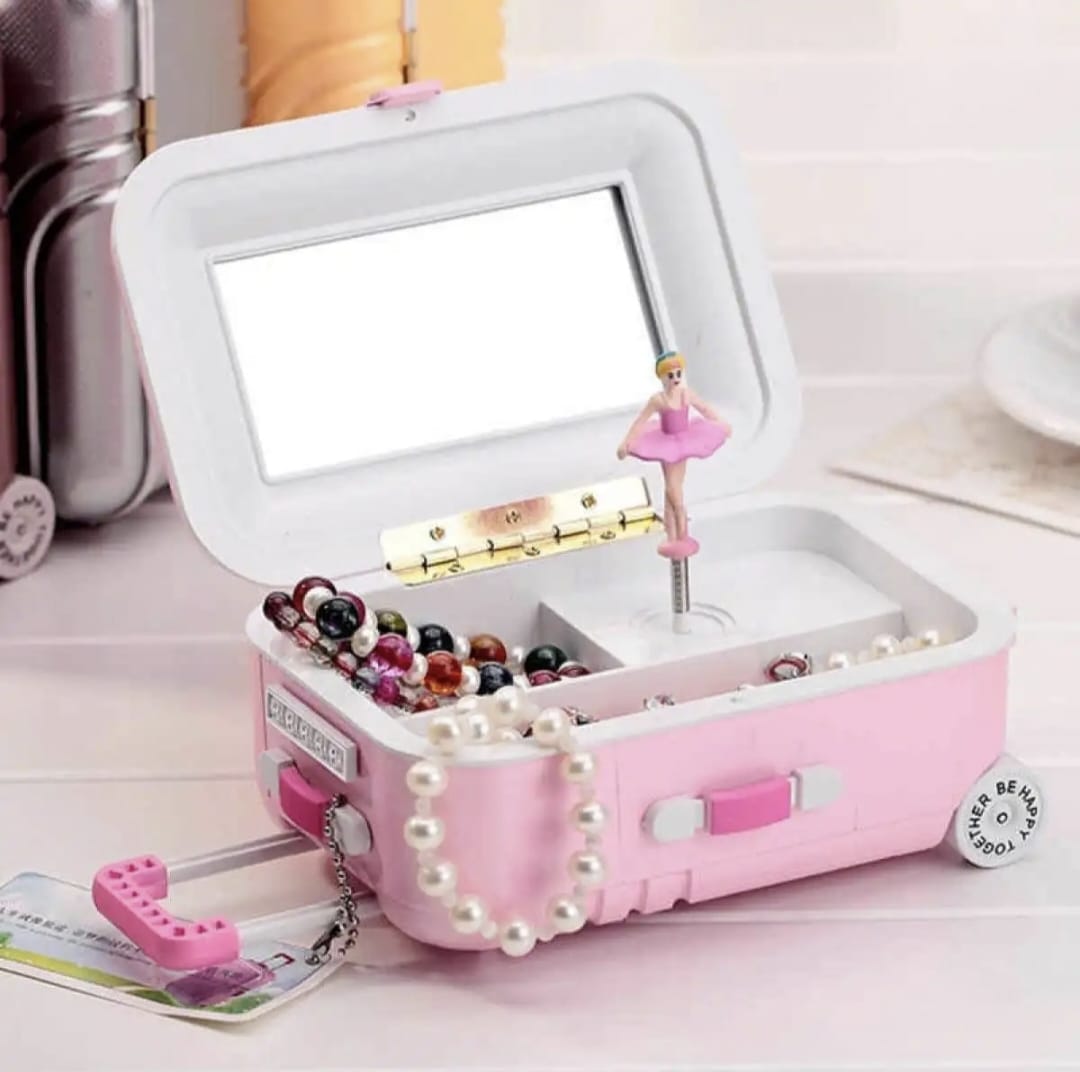 Keep your precious jewelry safe and beautifully organized with this Mini Suitcase Jewelry Box. Designed in a stylish suitcase shape, it features a built-in mirror and a rotating ballerina doll that adds a magical touch every time you open the box. Perfect for storing necklaces, bracelets, rings, and earrings, this jewelry box is both practical and decorative. Available in two colors – Pink and Gray, it’s a charming gift for kids and adults alike.