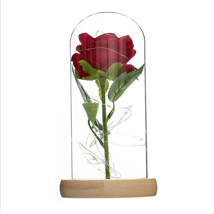 Bring a touch of magic to your home with this enchanting rose LED lamp. Inspired by timeless fairy tales, this beautiful red rose is encased in a transparent glass dome, illuminated by warm LED string lights for a cozy and romantic ambiance. Perfect as a nightlight, home décor, or a thoughtful gift for a loved one.
